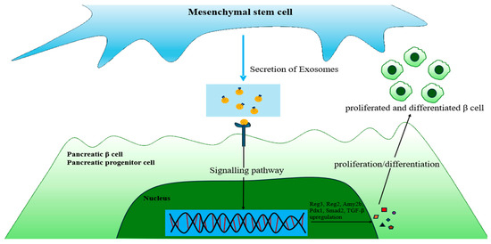 Application of exosomes for β-cell regeneration in T1DM. MSC-derived exosomes act directly on pancreatic β-cells to upregulate the expression of Reg3, Reg2, Amy2b, Pdx1, Smad2, TGF-β, and genes related to cell proliferation/differentiation. Thus, MSC-derived exosomes can regenerate damaged β-cells. Amy2b = amylase alpha 2B; PDx1 = pancreatic and duodenal homeobox 1; Smad2 = SMAD Family Member 2.