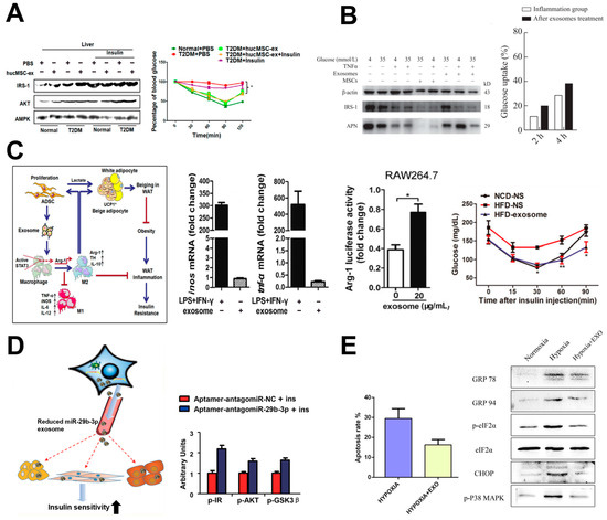 - Chen, M.-T.; Zhao, Y.-T.; Zhou, L.-Y.; Li, M.; Zhang, Q.; Han, Q.; Xiao, X.-H. Exosomes derived from human umbilical cord mesenchymal stem cells enhance insulin sensitivity in insulin resistant human adipocytes. Curr. Med. Sci. 2021, 41, 87–93. [Google Scholar] [CrossRef] [PubMed]