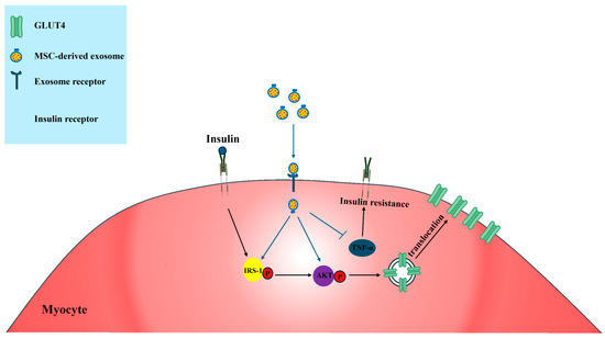 Application of exosomes for myocyte insulin resistance in T2DM. MSC-derived exosomes act on myocytes to increase the expression of p-IRS1 and p-AKT, which are involved in the insulin signaling pathway, leading to increased GLUT4 translocation. Furthermore, MSC-derived exosomes downregulate TNF-α and improve cellular insulin resistance. IRS = insulin receptor substrate. AKT = protein kinase B; GLUT = glucose transporter; Blue arrows = signal transduction process of exosome; Black arrows = signal transduction process of insulins.