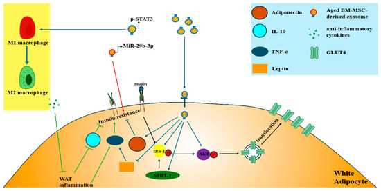 Application of exosomes for adipocyte insulin resistance in T2DM. Aged BM-MSC-derived exosomes induce insulin resistance in adipocytes. p-STAT3 present in MSC-derived exosomes acts on WAT to convert M1 Mφ to the Arg-1highM2 Mφ subtype. Anti-inflammatory cytokines released from the Arg-1highM2 Mφ subtype inhibit WAT inflammation and improve insulin resistance. MSC-derived exosomes also act on white adipocytes to increase SIRT-1 and adiponectin expression and decrease leptin expression, improving insulin resistance. STAT = signal transducer and activator of transcription; WAT = white adipose tissue; Blue arrows = signal transduction process of exosome; Red arrow = induction of IR by MiR-29b-3p in exosomes released by aged BM-MSC; Green arrows = signal transduction process of anti-inflammatory cytokines; Black arrows = signal transduction process of insulins.