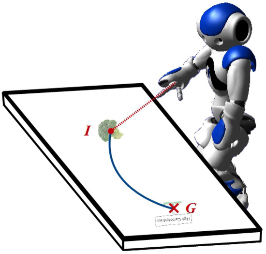 A humanoid robot (Aldebaran Nao is shown) interacting with a virtual object displayed on the touchscreen: in the example interaction shown, an image is to be moved from an initial position (I) to a goal position (G), along a defined path (blue line). The robot does not make direct contact with the screen, but instead coordinates its movement with that of the virtual object shown on screen.