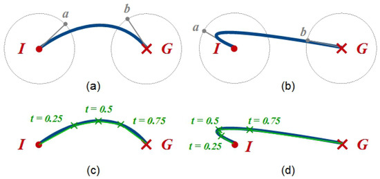 Constructing Bezier curve paths for virtual objects: the control points a and b are defined on the circumference of a unit radius circle around the initial (I) and goal (G) points of the movement, respectively. (a) Standard curve; (b) Bezier curve giving the impression of the robot ‘changing its mind’ on goal location mid-move by setting the first Bezier control point in the opposite direction to the goal location; (c) converting Bezier curve to robot control behaviour using three intermediate Bezier curve parameter values; (d) intermediate points are closer together on sharp curves facilitating robot control.