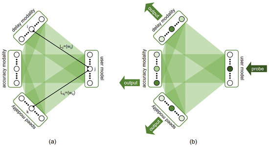 At the start of an interaction, the network is empty: i.e., the modalities are present, but there are no associative links in the system. Through interaction, and specifically as the human performs touchscreen-oriented behaviour, associative links are formed between the individual modalities and the user model of the person present at that time (Figure 3a). Note that such associative links are also formed between the touchscreen modalities themselves—this supports the mechanism of cross-modal priming [33] (these links are not shown in Figure 3a for clarity). This process of formation and the subsequent updating of associative links allows the learning of the human touchscreen-oriented behaviour.