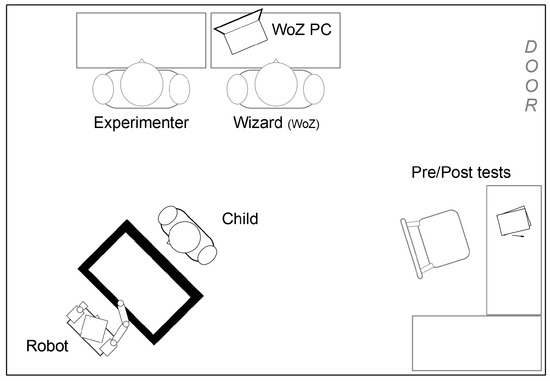 The experimenter was responsible for bringing the children to the experiment room from their classroom, briefing the children on what would happen, administering the paper-based pre-test, introducing the robot system (as a peer), administering the post-test, and then debriefing the children whilst returning them to their classroom. During this process, the children were out of their classroom for between 15 and 20 min. The variation in this time out of the classroom was primarily due the speed with which the children filled in the pre- and post-tests. This process was not rushed, and the children were free to take their time. The role of the wizard was to initialise the robot system, start the robot behaviour at the start of the interaction, and initiate the end of interaction behaviour after 5 min of interaction time. Each of these behaviours, once triggered, ran autonomously. All of these functions were controlled through a GUI on a remote PC. During the interactions, both the experimenter and wizard remained in the experiment room, but were consistently positioned to be out of the direct line of sight for the child (Figure 4).