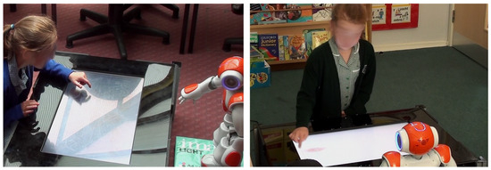 Two sample interactions showing how the children and robot collaboratively interacted around the touchscreen.