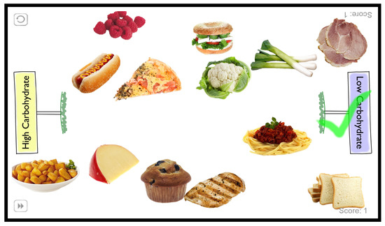 The child was then brought over to the robot, at which point the experimenter explained to both the child and the robot what the task was; the robot behaviour was autonomous with a human wizard (out of direct line of sight of the child) triggering the different phases of the behaviour (initialise, start, and end). The task was a sorting game played collaboratively between the robot and subject on the Sandtray touchscreen (Figure 5): displayed were a number of images of food, with the task being to decide whether each type of food had lots or only a little amount of carbohydrate contained (Figure 6). Both the subject and robot could make moves on the screen: the screen displayed visual and auditory feedback on a classification event by either interactant (for both correct and incorrect classifications). The robot did not explicitly employ a turn-taking strategy, although in most cases, such a behaviour emerged [38]. Once all the images had been classified, a new set of food images could be displayed, with the category positions reversed on alternate image sets. Images of food were divided into sets only to minimise the overlap of images on the screen at any one time. The robot acted as a peer throughout the interaction; this meant that the robot made mistakes (to varying degrees, see below), and encouraged rather than instructed with its feedback utterances.