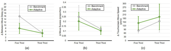 The first experimental hypothesis (H1) proposes that children will align their touchscreen-directed behaviour to those of the robot. The benchmark experimental condition allows a direct examination of this, since the robot’s behaviour does not change over time; the child’s behaviour has no impact on the behaviour of the robot. While only a basic ratio metric, the alignment factor (AF) that was introduced characterises the degree of behavioural alignment for an individual interaction pair, in this case between the child and the robot. For the benchmark condition, it was shown that there is a mean AF of +0.155, indicating convergence between the touchscreen-directed behaviour of the child and the robot. This is not statistically significant (the 95% CI of the mean is ), but shows a trend to a positive AF. As such, this indicates moderate support for H1. Having a positive AF for the benchmark condition is not necessarily surprising, given the range of existing observations in the literature regarding human behavioural alignment with a variety of computer and robot devices in a range of modalities (Section 4). In being in accordance with the existing literature, this result is nevertheless useful in demonstrating the robustness of the methodology we employ here.