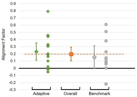 Considering the values of the alignment factor obtained for each individual, it may be seen that there is a relatively high degree of variability within the conditions, and that there is relatively little difference (in the mean) between the conditions (Figure 8). Nevertheless, overall characteristics by condition can be derived: while there is no significant difference between the conditions (, ), there is an indication that Alignment Factors in the adaptive condition as a group are above zero (indicating alignment: 95% CI does not contain zero), whereas this is not the case for the benchmark condition (95% CI ). This result provides moderate support of hypothesis H2 (a greater mutual adaptation in the adaptive condition than in the benchmark condition).