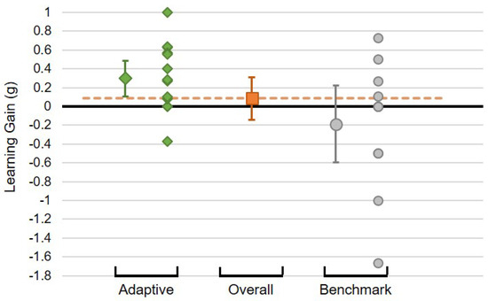 Mean learning gains of the Adaptive and Benchmark conditions. Orange point and dashed line: overall mean across both conditions. Error bars show 95% CI.