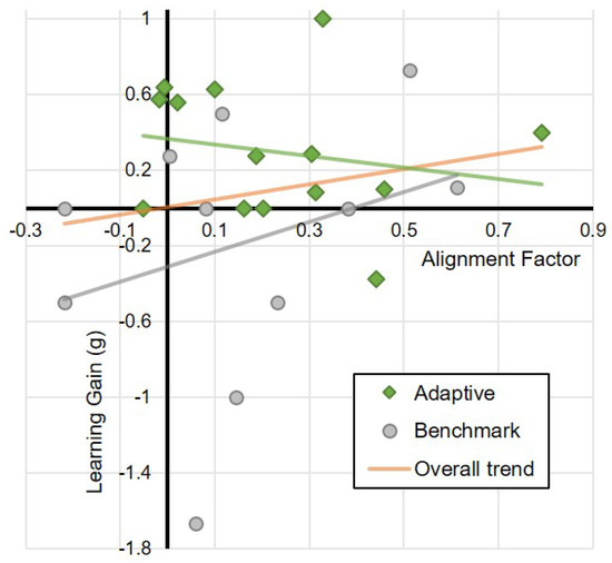 One final aspect of the results to consider is the relationship between the observed alignment factor and the learning gain achieved by the children (Figure 10). Since the learning outcome results seem to indicate that there is a significant learning effect for the Adaptive robot condition, it may be reasonable to expect that there would be a positive association between AF and learning gain. However, this is not observed as clearly as may be expected. While marginal effects may be interpreted from the graph, the slopes of the regression lines for both the Adaptive condition (95% CI: ) and the Benchmark condition (95% CI: ) are not significantly different from zero, indicating no meaningful association between learning gain and AF.