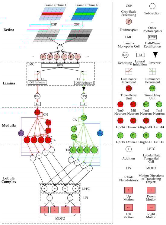 In nature, Drosophila, as a model organism, has evolved over millions of years to develop a robust and stable visual neural system that plays a vital role in its survival, and it has better motion sensitivity than humans [,]. Detecting the motion direction of the translating object has become one of the fundamental survival skills of Drosophila, which plays a significant role in daily behavior, such as avoiding predators, chasing prey, and so forth [,]. A variety of bio-inspired models are proposed based on motion-sensitive visual neurons of Drosophila [], which are widely used in robots [] and drones []. From biology to bio-inspired modeling and even to biomimetic applications, the physiological mechanisms of the Drosophila visual neural system provide many inspirations. The motion direction of the object, as one of the important motion features of the object, provides a basis for the higher-order neural structure (central brain) to make decisions []. The initial motion-directional detection model to express the behavioral and physiological characteristics of Drosophila is the elementary motion detector (EMD) [], which is widely used in the fields of intelligent devices [,]. However, the detection performance of the EMD and a series of improved EMD-based models [,,] under complex dynamic backgrounds is not satisfactory. With the revelation of the physiological mechanism of the motion-sensitive neurons of Drosophila, the LPTC has been shown to have a strong response to translating wide-field objects and the motion of local salient objects []. Subsequently, several bio-inspired models based on the LPTC have been put forward by mathematicians, which have proven to have excellent detection performance under complex dynamic backgrounds []. In the visual neural system of Drosophila, the retina and the optic lobe are two significant biological structures for detecting motion features and objects. The retina is responsible for perceiving the change in luminance and color information from the natural environment, while the optic lobe is a multi-layered structure responsible for processing the change in luminance and color information, and further detecting motion features and objects [,].