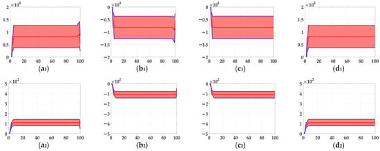 The experimental results of the mean and standard deviation based on dataset II. Horizontal axis represents time in frames; vertical axis represents the mean and standard deviation. (a1,a2) represent the translating object in the upward motion; (b1,b2) represent the translating object in the downward motion; (c1,c2) represent the translating object in the leftward motion; (d1,d2) represent the translating object in the rightward motion; (a1–d1) represent the mean and standard deviation of Model 2; and (a2–d2) represent the mean and standard deviation of the proposed bio-inspired model.