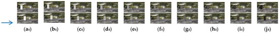 Sample frames 40 and 80 from 10 groups of synthetic real-world complex noisy visual stimulus sequences from one sample (ID = 8) of dataset IV (SPN ratio: 0.04). The light blue arrows represent the motion direction of the translating object. (a1–j1) represent the translating object in the upward motion; (a2–j2) represent the translating object in the downward motion; (a3–j3) represent the translating object in the leftward motion; and (a4–j4) represent the translating object in the rightward motion. The gray values of the translating objects in , , , , , , , , , and are 250, 225, 200, 175, 150, 125, 100, 75, 50, and 25, respectively.