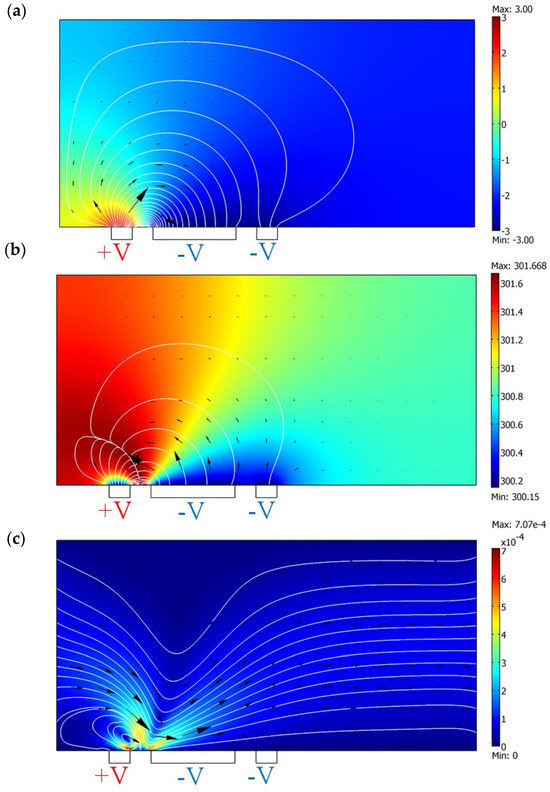 Simulation results for ACET flow. (a) Surface plot indicates electric potential [V], and the arrow and streamlines indicate electric field [V/m]. (b) Surface plot illustrates temperature [K], and the arrow and streamlines illustrate temperature gradient [K/m]. (c) Surface plot, arrow and streamlines depict fluid velocity field [m/s].