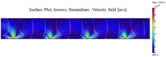 In this relationship, ρ represents the fluid density, cp is the specific heat capacity of the fluid, and u is the fluid velocity vector. Considering that the fluid velocity in the microchannel is very small, a good approximation is that the temperature at the input and output of the channel is equal to the ambient temperature [34]. As a result, the generated thermal gradient changes the electrical and dielectric properties of the fluid [35]. The fluid motion and the flow generated inside the microchannel can be analyzed using the continuity equation and the Navier–Stokes equations [36]: