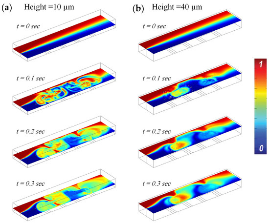 The species concentration distribution inside the microchannel for different times: (a) 10 μm height; (b) 40 μm height.
