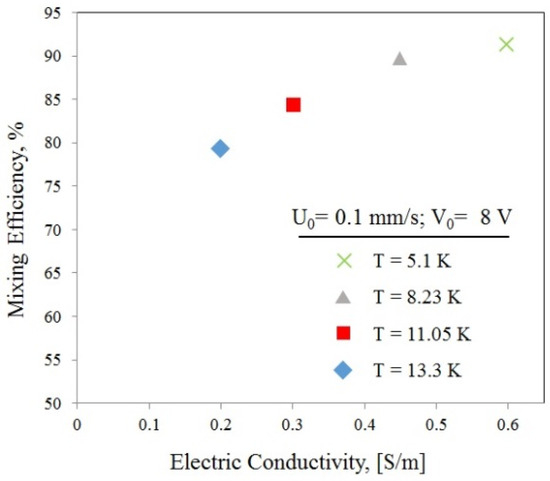 Mixing efficiency and generated temperature rise for different electric conductivities.