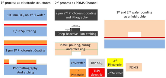 The fabrication process is carried out based on the concepts of AC electrothermal effects and the simulation results. From a fabrication point of view, we determined the appropriate electrode structure for electric actuation, the dimensions of the microchannel, and the necessary conditions for selecting the suitable substrate and microchannel. Therefore, a silicon wafer was chosen for the substrate, platinum for the electrodes, and PDMS material for the microchannel. The micromanipulator fabrication process, based on the AC electrothermal effect, consists of two process flows, as shown in Figure 8. The first process flow is for the electrode structure deposition, and the second one is for the fabrication of the Si mold for the PDMS microchannel.
