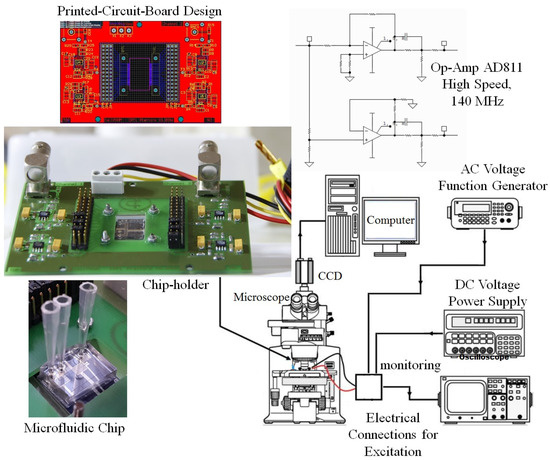 To implement the testing process, an electronic circuit was designed, including four signal amplifiers for electrode activation. Two of the amplifiers were biased in an inverting mode, and the other two were biased in a non-inverting mode, allowing the alternating positive and negative signals to be easily applied to the electrical contacts of the fluidic chip via jumpers (as shown in Figure 10). The designed PCB circuit not only supplies the driving circuits but also includes a space for the chip holder, as shown in the figure, which is responsible for keeping the chip fixed during the testing process.