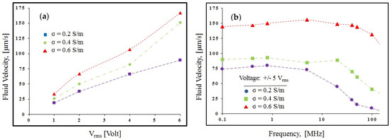 Experimental results for fluid velocity: (a) electric potential and σ effect; (b) frequency effect (from 100 kHz to 140 MHz).