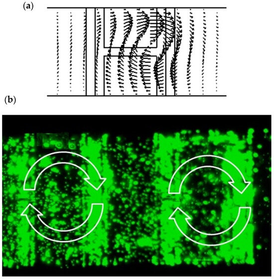 AC electrothermally driven rotational flow: (a) finite element analysis results; (b) experimental results.