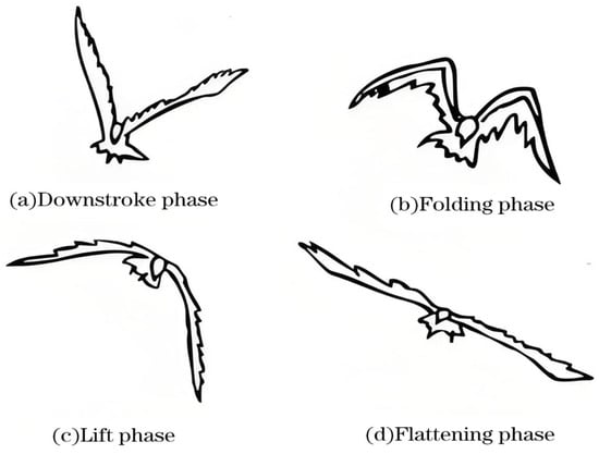 Birds modify their wing shape during flight to minimize aerodynamic drag and optimize energy efficiency. Figure 1 illustrates the four stages of the wingbeat cycle: downstroke, folding, upstroke, and flattening [,,]. In the downstroke stage, the wings beat downward and twist forward, creating a negative angle of attack that generates both lift and thrust. During the folding stage, the outer wing briefly folds into a triangular shape due to inertia in preparation for the upstroke. In the upstroke stage, the scapula lifts first, the wrist slightly flexes backward, and the outer wing forms a drooped arch. During the flattening stage, the scapula descends from the peak of the upstroke, and the wings gradually flatten in preparation for the next wingbeat cycle.
