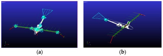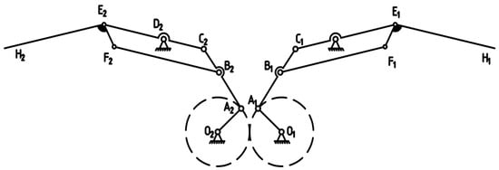 where  is the number of active components,  is the number of lower pairs, and  is the number of higher pairs. For this double-crank mechanism, the number of active components is , the number of lower pairs is , and the number of higher pairs is , resulting in a calculated degree of freedom of . Since the secondary linkage’s degree of freedom is zero, the entire system retains a degree of freedom of one, ensuring the precision and stability of the flapping mechanism’s movement. Drawing on the structural design from [] this paper integrates the inner and outer wing rods during the hinging process to achieve a more compact structure. The meticulously designed double-crank–double-rocker mechanism ensures synchronized motion and consistent flapping amplitude across both wings, significantly boosting the aircraft’s stability. This synchronized design plays a crucial role in preventing instability due to uncoordinated wing movements, while its efficient structural layout further reduces mechanical wear and energy consumption.