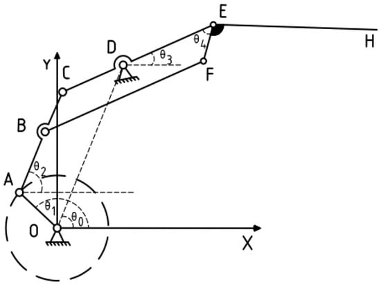 The analysis of bird wing movement and the development of a wing model can replicate the “flapping folding” actions observed during bird flight. A simplified model was developed based on the wing movement pattern, as illustrated in Figure 4, with point O as the gear center, OA as the crank, and AC as the link rod of known length. Parallelogram BCEF represents the inner wing segment, with point D representing the fixed support point. EH represents the outer wing section, which is articulated with the inner segment by a hinge. The trajectory equations for the inner and outer wing segments are primarily represented by points E and H.