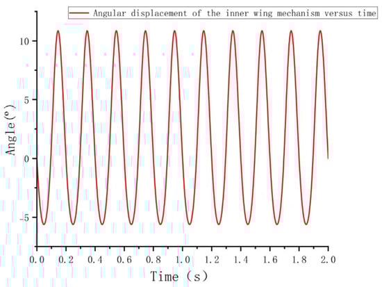 As shown in Figure 8, the angular displacement of the inner wing mechanism displays distinct, periodic sinusoidal oscillations, with a period of approximately 0.2 s. During each cycle, the angular displacement increases from a negative value (approximately −10 degrees) to a positive peak (around 10 degrees), and then decreases to a negative peak, demonstrating the characteristic reciprocating motion. Over time, the angle alternates consistently between positive and negative values, indicating that the inner wing mechanism’s motion is both symmetrical and highly repeatable.