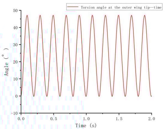 Figure 10 illustrates the periodic oscillations of the torsional angle at the outer wingtip over time, fluctuating between increasing and decreasing phases. This pattern indicates that the wingtip reacts to periodic aerodynamic forces, such as lift and drag, during flight. Initially, the torsional angle increases sharply before settling into a stable oscillatory pattern. The analysis reveals regular variations in the maximum and minimum values of the torsional angle, illustrating dynamic adaptations under aerodynamic loading. Over time, the torsional angle consistently recovers and stabilizes, reflecting the system’s rhythmic adaptation to aerodynamic forces.