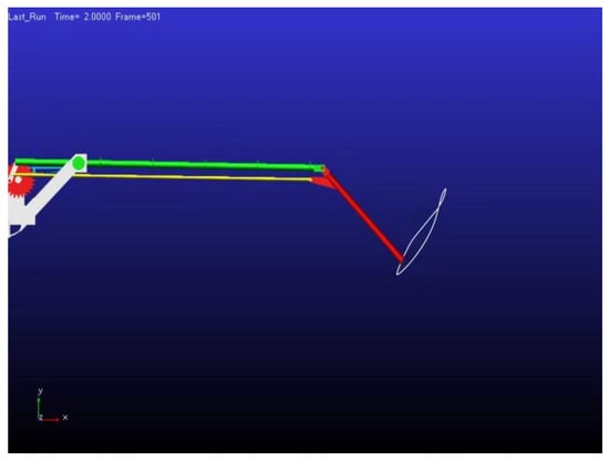 Based on the derived equations of motion for both the inner and outer wing sections, a kinematic analysis was conducted of the designed foldable-wing-flapping aircraft. The flapping mechanism was optimized according to the specified design parameters and predefined mechanical constraints []. Motion simulations and analyses were performed using the ADAMS simulation platform. The resulting motion trajectories of the inner and outer wing sections are shown in Figure 6.