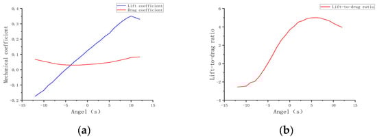As shown in Figure 13, the initial angle of attack significantly influences the aerodynamic characteristics of the flapping-wing aircraft. Within the angle of attack range from 0° to 6°, the lift steadily increases, and the lift-to-drag ratio reaches its maximum, indicating optimal aerodynamic performance. However, when the angle of attack exceeds 6°, despite the continued increase in lift, the rapid rise in drag results in a decrease in the lift-to-drag ratio, potentially increasing the risk of the aircraft stalling [].