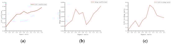Figure 15 shows that as the aspect ratio decreases from 5.5 to 4.5, the lift decreases accordingly, revealing a trend where lower aspect ratios result in a gradual reduction in lift. Correspondingly, the drag shows only minor variations. Although drag fluctuates slightly with changes in aspect ratio, the lift-to-drag ratio shows noticeable changes. Overall, the lift-to-drag ratio shows a positive correlation with the aspect ratio, meaning that an optimal range of aspect ratios leads to higher aerodynamic efficiency [].