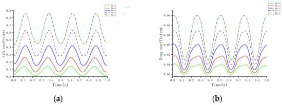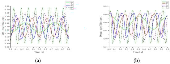 Curves at different frequencies. (a) Lift coefficient; (b) Drag coefficient.