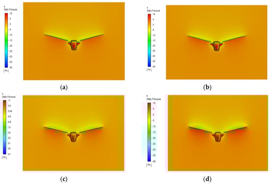 Pressure distribution contour plot of the wing in various directions of the model. (a) Front view; (b) Oblique side view; (c) Front view; (d) Side view.