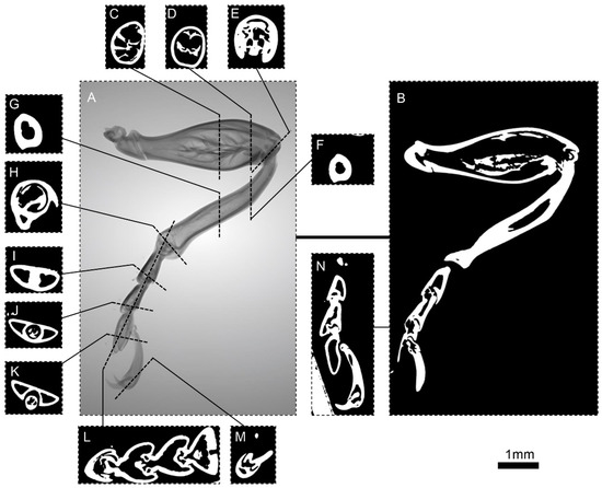 Micro-CT images of the midleg of S. femorata. (A) Three-dimensional reconstruction of the midleg surface. (B) Cross-sectional view of the midleg. (C,D) Cross-sectional view of the midleg femur. (E) Cross-sectional view at the joint between the femur and tibia. (F,G) Cross-sectional view of the midleg tibia. (H) Cross-sectional view at the joint between the femur and tibia. (I–K) Cross-sectional view of the first, second, and third mid tarsomeres. (L) Sectional view of the mid tarsus. (M) Cross-sectional view of the fore tarsus. (N) Sectional view of the terminal actuator of the midleg.