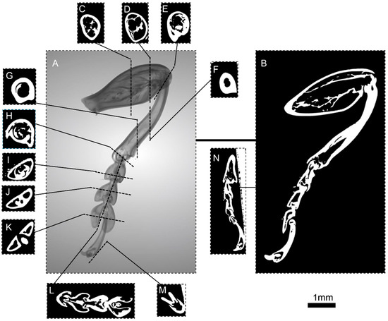 Micro-CT images of the foreleg of S. femorata. (A) Three-dimensional reconstruction of the foreleg surface. (B) Cross-sectional view of the foreleg. (C,D) Cross-sectional view of the foreleg femur. (E) Cross-sectional view at the joint between the femur and tibia. (F,G) Cross-sectional view of the foreleg tibia. (H) Cross-sectional view at the joint between the femur and tibia. (I–K) Cross-sectional view of the first, second, and third fore tarsomeres. (L) Sectional view of the fore tarsus. (M) Cross-sectional view of the fore tarsus. (N) Sectional view of the terminal actuator of the foreleg.