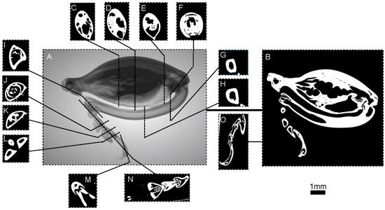 Micro-CT images of the hindleg of S. femorata. (A) Three-dimensional reconstruction of the hindleg surface. (B) Cross-sectional view of the hindleg. (C–E) Cross-sectional view of the hindleg femur. (F) Cross-sectional view at the joint between the femur and tibia. (G,H) Cross-sectional view of the hindleg tibia. (I) A cross-sectional view of the joint between the femur and tibia. (J–L) Cross-sectional view of the first, second, and third hind tarsomeres. (M) Cross-sectional view of the fore tarsus. (N) Sectional view of the hind tarsus. (O) Sectional view of the terminal actuator of the hindleg.