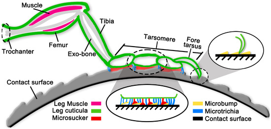 - Thomas, J.; Gorb, S.N.; Buescher, T.H. Comparative analysis of the ultrastructure and adhesive secretion pathways of different smooth attachment pads of the stick insect Medauroidea extradentata (Phasmatodea). Beilstein J. Nanotechnol. 2024, 15, 612–630. [Google Scholar] [CrossRef]