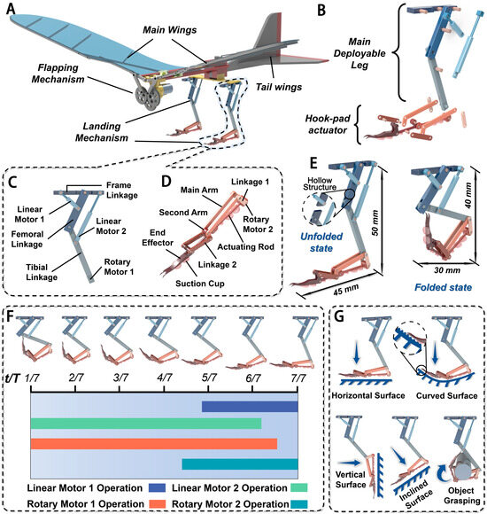The multi-tarsomere structure of S. femorata’s legs is mimicked, and a multi-linkage mechanism scheme is adopted to achieve the design of the bionic landing mechanism, as shown in Figure 6. The bionic landing mechanism primarily consists of two parts: the main deployable leg and the hook-pad actuator. It consists of the frame linkage, femoral linkage, tibial linkage, micro linear motor, micro rotary motor, main arm, second arm, end effector (bifurcated claw), linkage, actuating rod, and micro suction cups. The main deployable leg is connected to the hook-pad actuator through a hinged joint. The overall dimensions of the design are as follows: 50 mm × 45 mm in the deployed state and 40 mm × 30 mm in the folded state (details are shown in Figure 6E). The schematic diagram after installing the bionic landing mechanism to FWMAV developed by our team is shown in Figure 6A.
