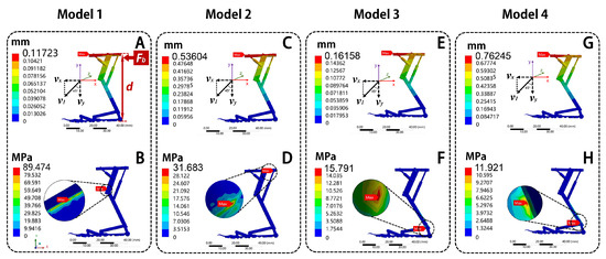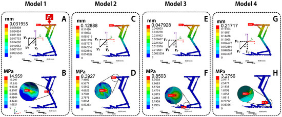 The diagrams of total deformation and equivalent stress of bionic deployable landing mechanism under bending moment. Total deformation: (A) Model 1, (C) Model 2, (E) Model 3, (G) Model 4; equivalent stress: (B) Model 1, (D) Model 2, (F) Model 3, (H) Model 4.