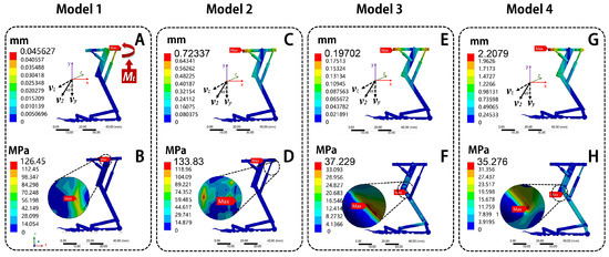 The diagrams of total deformation and equivalent stress of bionic deployable landing mechanism under uniform load. Total deformation: (A) Model 1, (C) Model 2, (E) Model 3, (G) Model 4; equivalent stress: (B) Model 1, (D) Model 2, (F) Model 3, (H) Model 4.