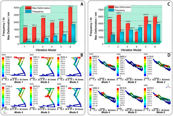 The vibration characteristics analysis diagram of bionic landing mechanism. The first six natural frequencies and max deformations of the landing mechanism (A) and the attachment mechanism (C); the total deformation mode shapes of the first six natural frequencies of the landing mechanism (B) and the attachment mechanism (D).