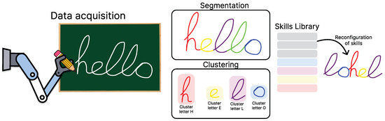 Within this field, there are various methods to address this problem. Some are derived from Reinforcement Learning (RL) processes, aiming to infer state–action relationships without explicitly defining a cost function, commonly referred to as Inverse Reinforcement Learning (IRL) [5,6]. Other approaches utilize Deep Learning techniques [7]. The methods employ discretizers such as Neural Networks to acquire the underlying skills of a task [8] or Transformers-based techniques to address high-dimensionality problems that may create distractions in the learning model [9]. However, among the most widely adopted methods are those that encode tasks through complex movements, which are both easily replicable and interpretable by algorithms. These include techniques based on movement primitives [10,11].