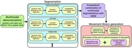 General algorithm of the processes and subprocesses performed by our approach. The algorithm begins with demonstrations that may be multimodal (i.e., derived from various sources such as the end-effector position, grip force, hand position, etc.). For each case, a segmentation process is carried out, including temporal alignment, an initial heuristic estimation of the segments, and a probabilistic combination using GMMs. If different segmentation sources are present, they are probabilistically combined using the same GMM process. After segmentation, the generation of the movement libraries begins. Segments are encapsulated using Gaussian Processes (GPs), over which their barycenters are estimated to calculate the total cost of transforming one segment to resemble another. This is achieved through the computation of the Wasserstein distance and Gaussian Optimal Transport. Iteratively, an energy cost is obtained, which determines how similar and efficient two segments are. Based on this value, the various libraries of primitives are created.