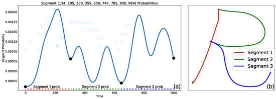 Complete solution after the probabilistic fusion process for the over-segmented data. (a) Representation of the normalized probability obtained after the GMM generation process and its combination. The black points represent the final keypoints on the probabilistic data, marking the locations where changes occur in the estimated common probabilities of the points. (b) Representation of the example “R” in 2D. After the process, the algorithm successfully generates three segments that encompass the representation of the entire task.