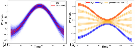 where is the set of GPs to be combined, are the weights assigned to each GP (), and is the space of Gaussian measures in a separable Hilbert space [47]. The barycenter’s mean is a weighted average () and its covariance () minimizes the energy cost of transforming the covariances of the original GPs to that of the barycenter.