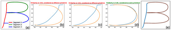 Example of evaluating the movement primitive libraries. (a) Initial segmentation, (b) normalized comparison of segment 1 against segment 2, which do not belong to the same primitive library, (c) normalized comparison of segment 1 against segment 3, which do not belong to the same primitive library, (d) normalized comparison of segment 2 against segment 3, which belong to the same primitive library, and (e) representation of each segment according to the library they belong to, where the same color indicates they are part of the same primitive library.