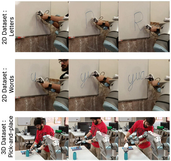 By leveraging the robotic platform for dataset generation, additional data such as the robotic hand’s position and end-effector force measurements could be collected. These multimodal data were integrated into the segmentation process using our SeGM algorithm, which supports advanced multimodal segmentation capabilities. For data collection via kinesthetic teaching, the robotic arms were operated in a weight-compensation mode. This mode allows users to move the robotic arm freely, preventing it from being affected by its own weight. For 2D tasks, a whiteboard was used to record demonstrations through drawing, whereas 3D tasks were conducted on a table to facilitate task-specific interactions. A visual example of the data collection for each dataset can be seen in Figure 9.