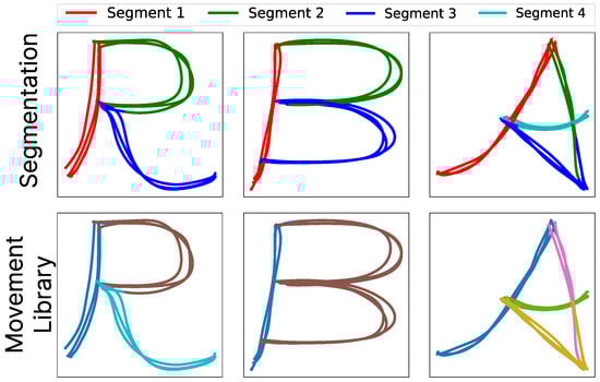 After explaining the operation of the developed algorithm for automatic segmentation and movement library generation, a series of tests were conducted for both 2D and 3D tasks to assess its qualitative performance. For the 2D experiments, two distinct datasets were created. The first dataset comprised uppercase letters, including all 26 letters of the alphabet, as individual elements. The second dataset consisted of word sequences, containing 20 different words ranging from 2 to 4 letters. For both datasets, segmentation and movement library generation were performed using only the geometric position of the data. Each dataset included three demonstrations for every element to capture variability in the execution of the same sequence. Additionally, the datasets were designed to be continuous, with letters written in an italic script to ensure that all segments of the uppercase letters were seamlessly connected.